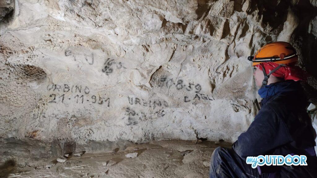 Qui troviamo le prime testimonianze delle esplorazioni con le scritte “Urbino 21-11-951” e “Cagli 30-08-52”.