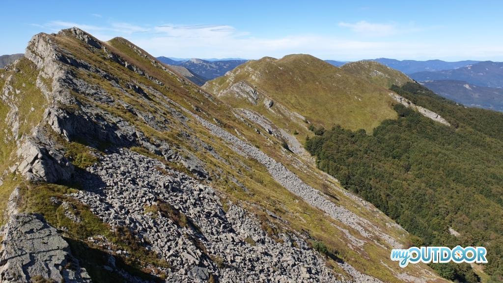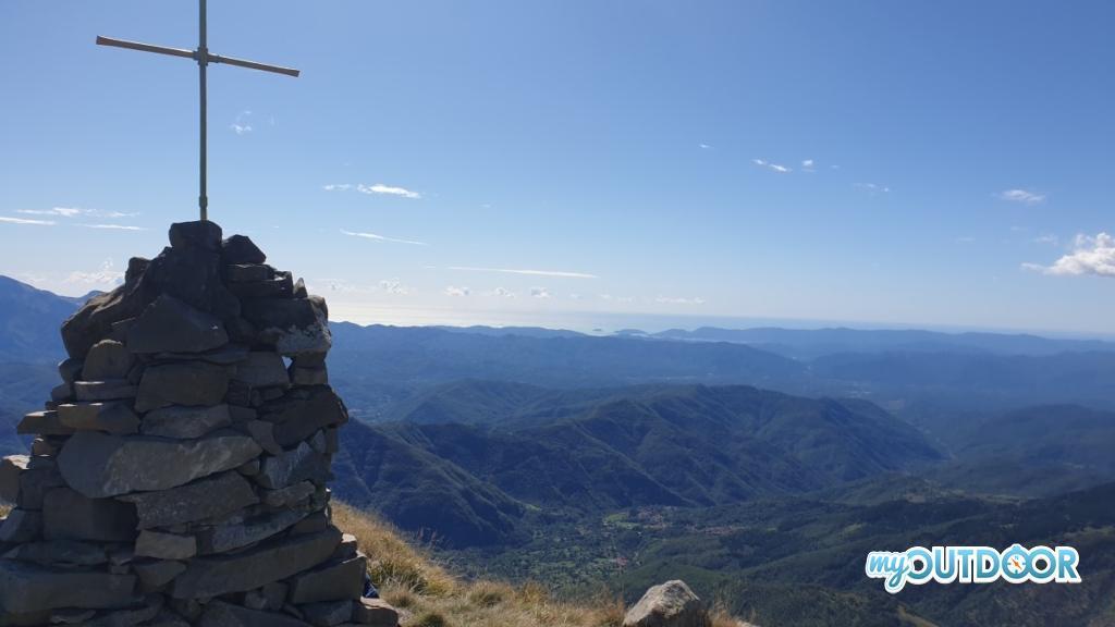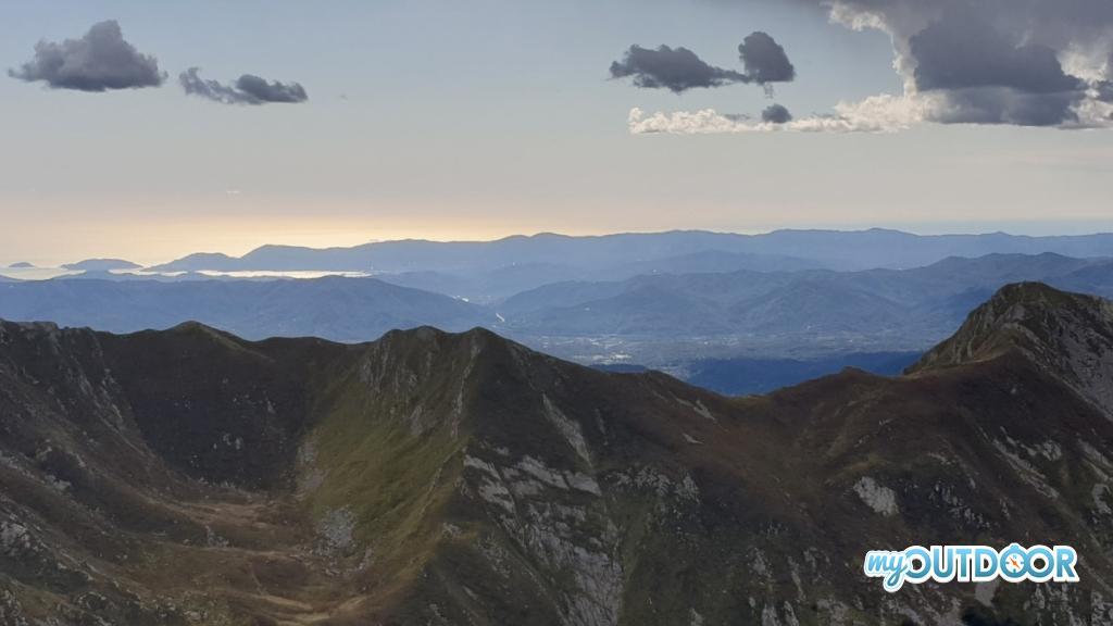 Continuo, sempre lungo il crinale, che a questo punto si fa più ripido e mi porta sulla cima Punta Buffanaro (1.878 metri s.l.m.). Complice anche la giornata fredda e il cielo terso, la vista da qui è stupefacente: a Ovest posso scorgere addirittura il Golfo della Spezia, mentre a Nord riesco a intravedere le cime innevate delle Alpi.