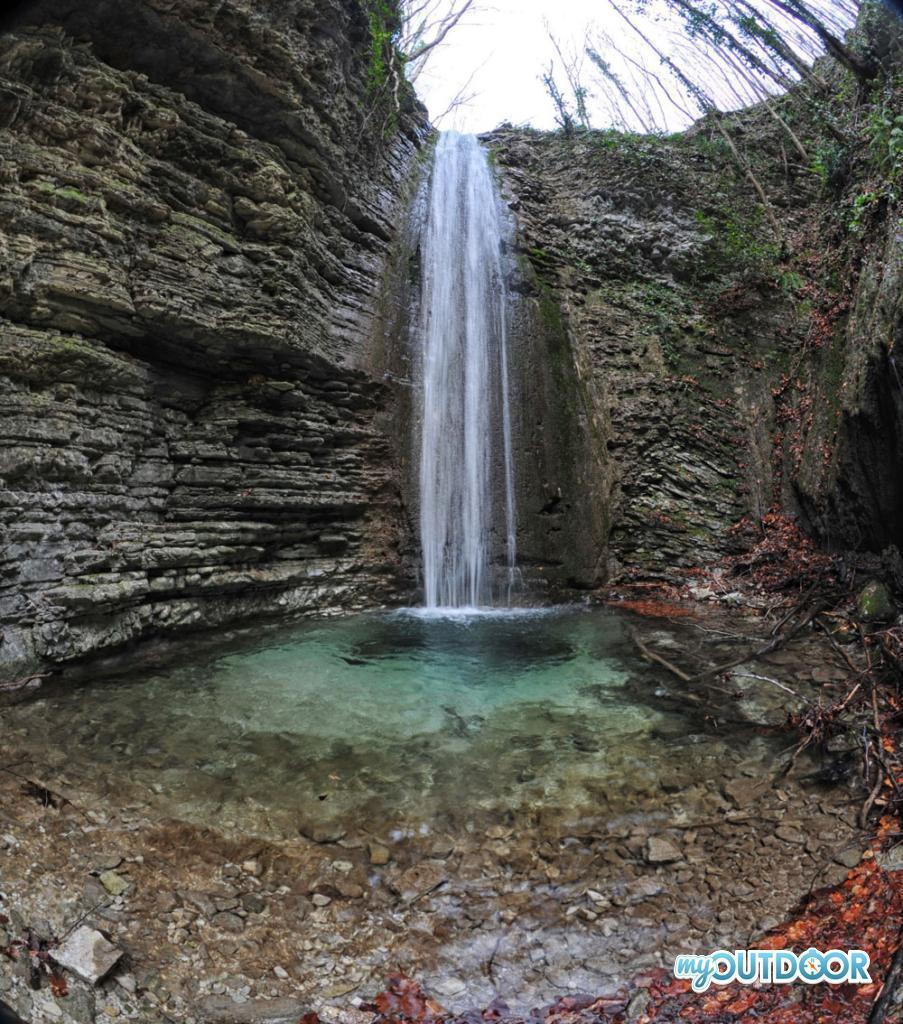 Camminando sopra i sassi del fiume è possibile entrate tra le due pareti di roccia e ammirare l’imponente cascata dell’Orrido.  Una cascata alta circa 25 metri e scavata nella roccia dallo scorrere delle acque a testimonianza della potenza della natura. Questo coincide con il tratto terminale della forra di Pian dell’Acqua caratterizzata da una cascata alta 70 metri.