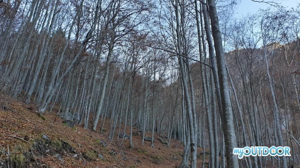 Lasciato il ponte, continuiamo a salire nel bosco per poi immetterci sulla strada sterrata (sempre n. 503) che ci porterà, in circa 6km e 750m di ascesa continua ma mai impegnativa, fino al Rifugio Bianchet, lungo la Valle del Vescovà e il suo faggeto i cui colori, come si può immaginare, d’autunno offrono forse il meglio.