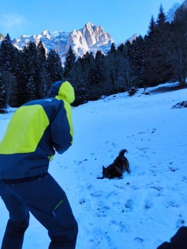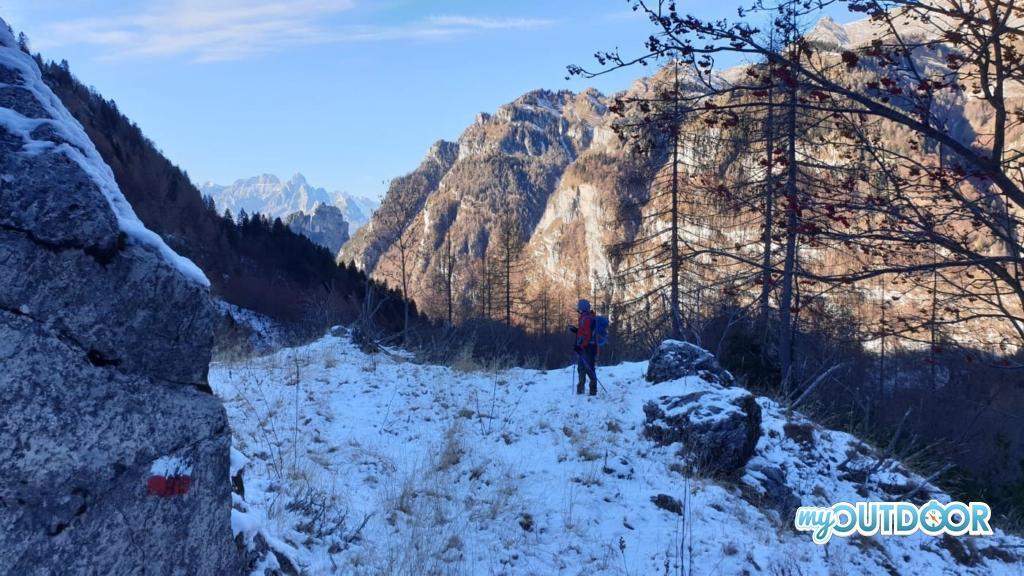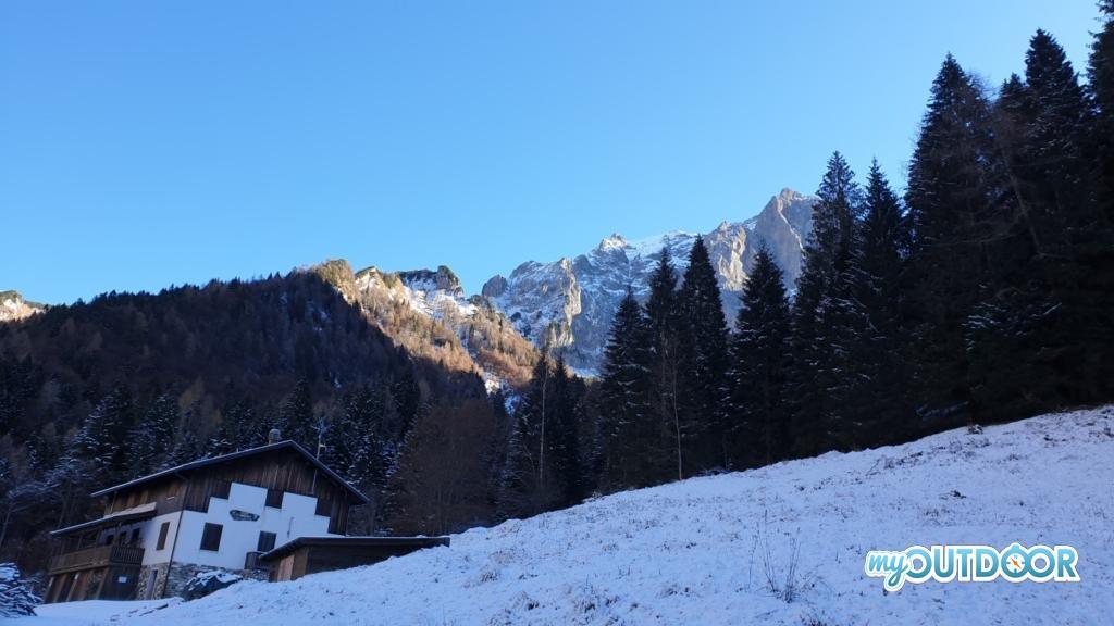 Giunti in circa 1h40 al Rifugio Bianchet (1.250 m s.l.m.) – siamo sul Pian de i Gat e sì, siamo stati decisamente veloci – troviamo la prima neve e iniziamo a scorgere il profilo roccioso del Monte Schiara, versante Nord-Ovest. In questo periodo (fine novembre) il rifugio è ovviamente chiuso ma dispone di una stanza-bivacco utilizzabile anche d’inverno con un paio di letti a castello e materassi. Il rifugio/bivacco è un utile punto d’appoggio per chi, partito come noi da La Muda, intenda salire in cima al Monte Schiara e spezzare l’escursione in due giorni (sono infatti oltre 2mila metri di dislivello).