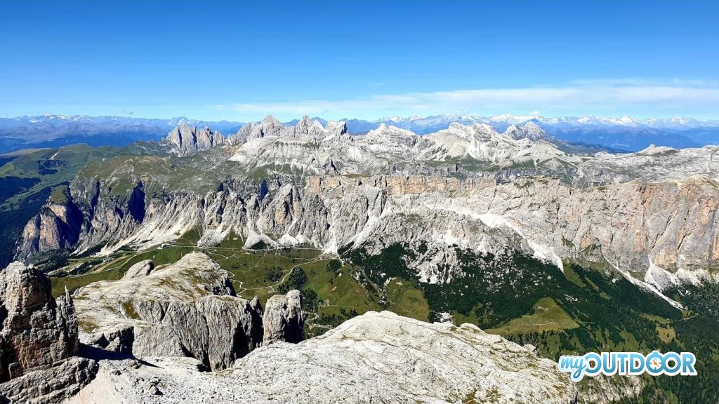 Teniamo duro e in poco tempo possiamo finalmente scorgere la croce di vetta, che raggiungiamo nel giro di qualche minuto. Il panorama dalla cima del Piz Pisciadù, a mio giudizio uno dei più belli di tutte le Dolomiti, contempla le cime del Gruppo delle Odle, del Sassolungo e Sassopiatto, del Catinaccio, delle Dolomiti Ampezzane, solo per citarne alcune.