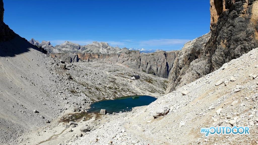 La ferrata Tridentina si conclude poco dopo il ponte dal quale, in pochi minuti, raggiungiamo il bel Lago Pisciadù e il Rifugio Franco Cavazza (2.587m).