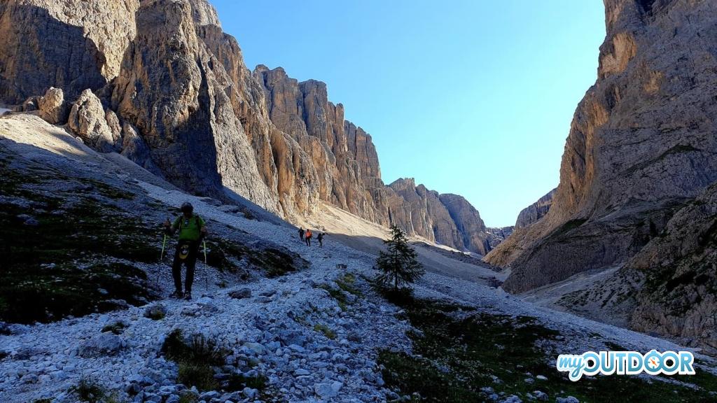 Noi ci teniamo sulla sinistra. Da questo punto in poi l’ascesa si fa un po’ più ripida e impegnativa, vuoi per la stanchezza accumulata finora, vuoi per la quota che inizia a farsi sentire. La progressione è prima su gradoni di roccia e poi su fondo di ghiaia mista a detriti, costantemente circondata da una visuale stupefacente: alle spalle iniziamo a intravedere il Piz Boè, mentre sulla destra abbiamo le splendide cime di Mezdì.