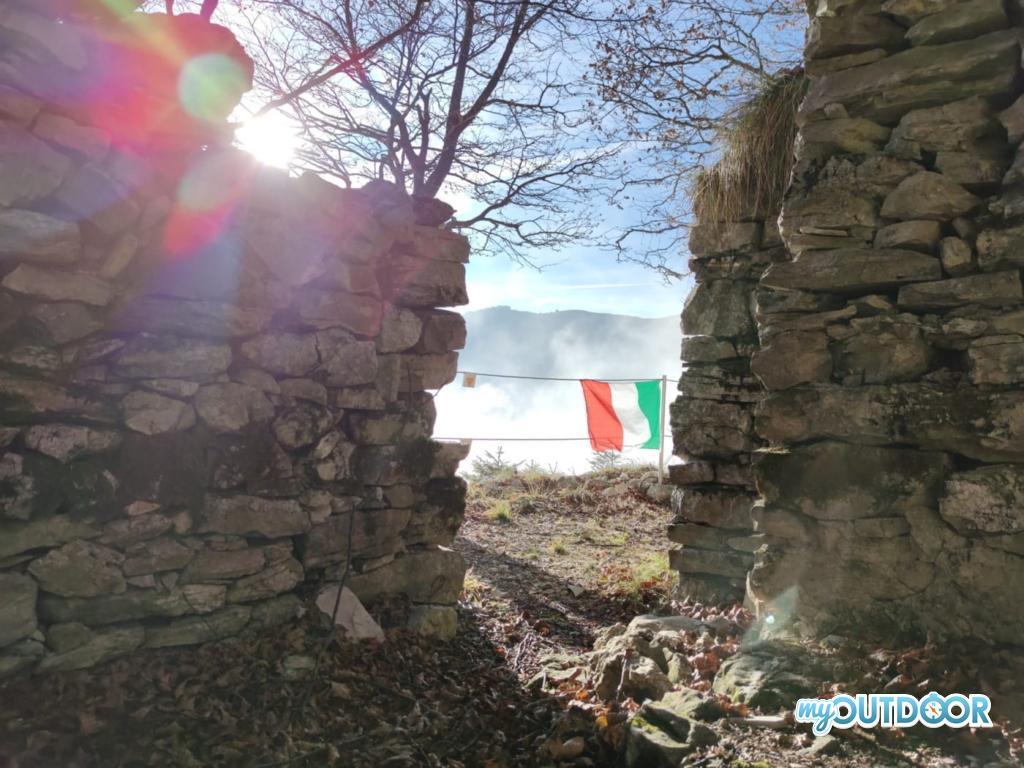 È possibile terminare la ferrata prima del ponte, immettendosi sul Sentiero delle Meatte. Proseguendo invece dopo il ponte (come abbiamo fatto noi) si scollina qualche metro a Est della cima, giungendo così lungo la trincea italiana che possiamo prendere sia verso Est che Ovest. Noi abbiamo proseguito verso Ovest, sostando nei pressi di un terrazzo naturale con vista su Cima Grappa e sulla Valle di San Liberale, nel quale abbiamo trovato i resti di manufatto bellico (muri a secco). Luogo ideale per una pausa panino (e nel nostro caso anche caffè), riparati dal vento.
